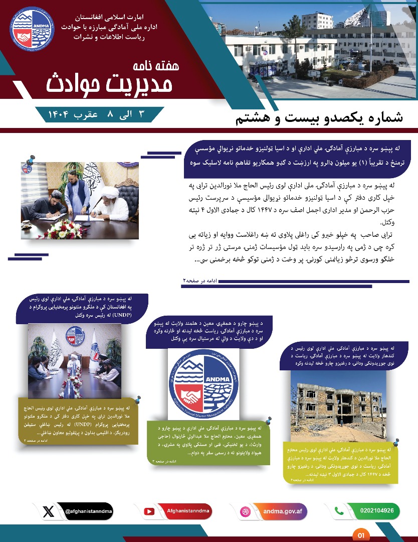 بر اساس تفاهمنامهٔ امضاشده میان ادارهٔ ملی آمادگی مبارزه با حوادث و مؤسسهٔ RRDPO، که تمویلکنندهٔ پروژهٔ آن برنامهٔ جهانی غذا (WFP) میباشد، ریاست آمادگی مبارزه با حوادث ولایت لغمان با. . .