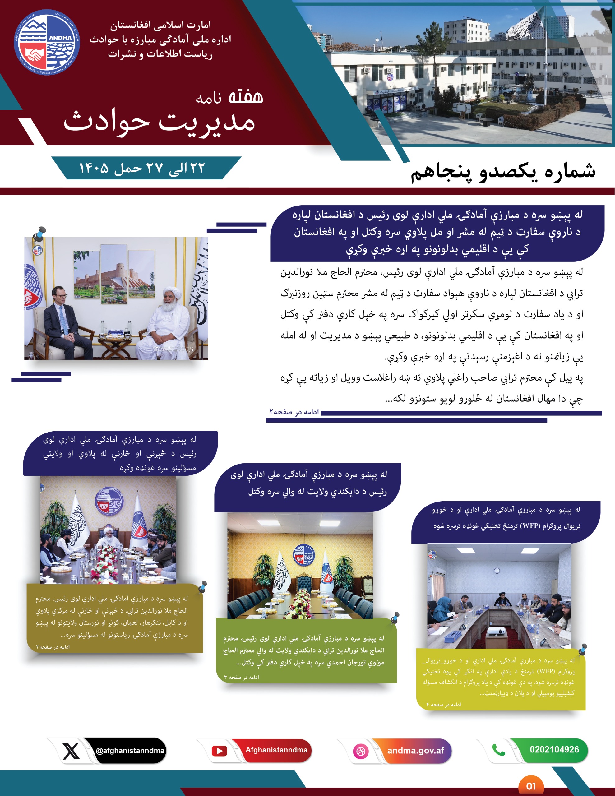صبح امروز، یک‌شنبه، محترم الحاج ملا نورالدین ترابی، رئیس عمومی اداره ملی آمادگی مبارزه با حوادث، در دفتر کارش با محترم فیضان احمد کاکر، معاون مؤسسه نو آنلوس، دیدار نموده و تفاهم‌نامه. . .