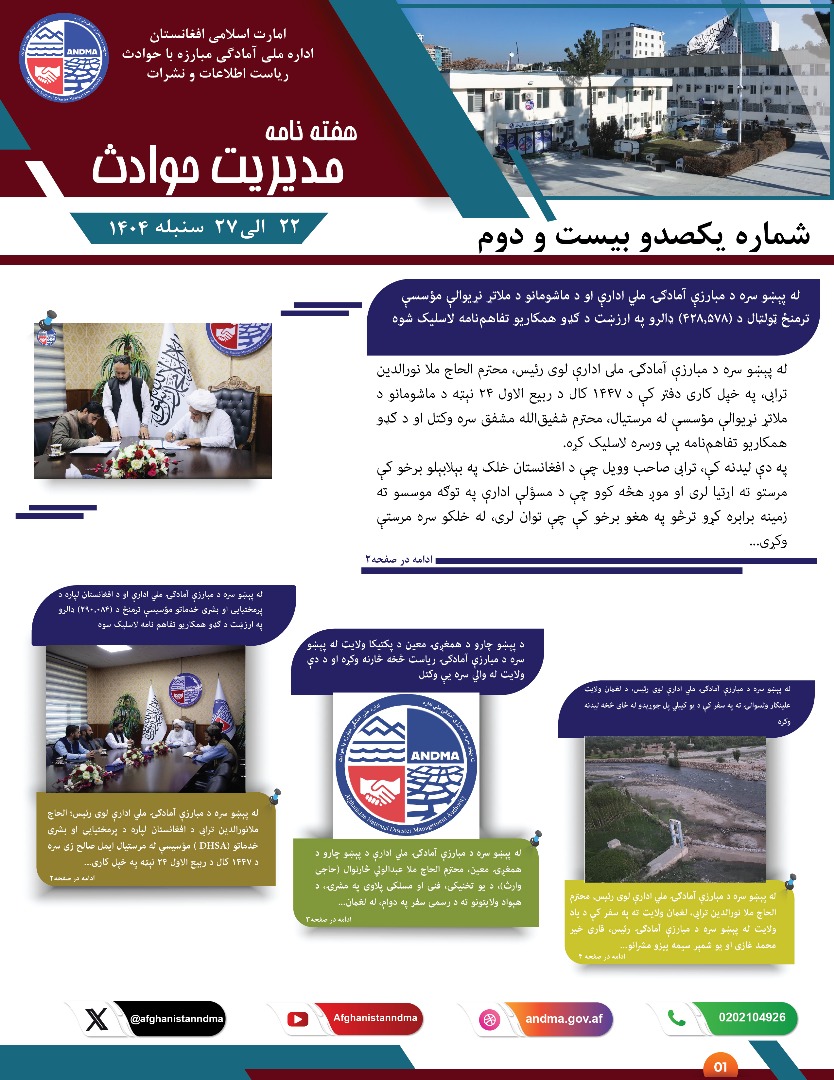 له پېښو سره د مبارزې آمادګۍ ملي ادارې او د ماهو موسسې ترمنځ د لاسلیک شوي هوکړه لیک له مخې، چې د پروژې تمویل کوونکی یې د خوړو نړیوال پروګرام (WFP) دی، د سرپل ولایت له پېښو سره د مبارزې. . .