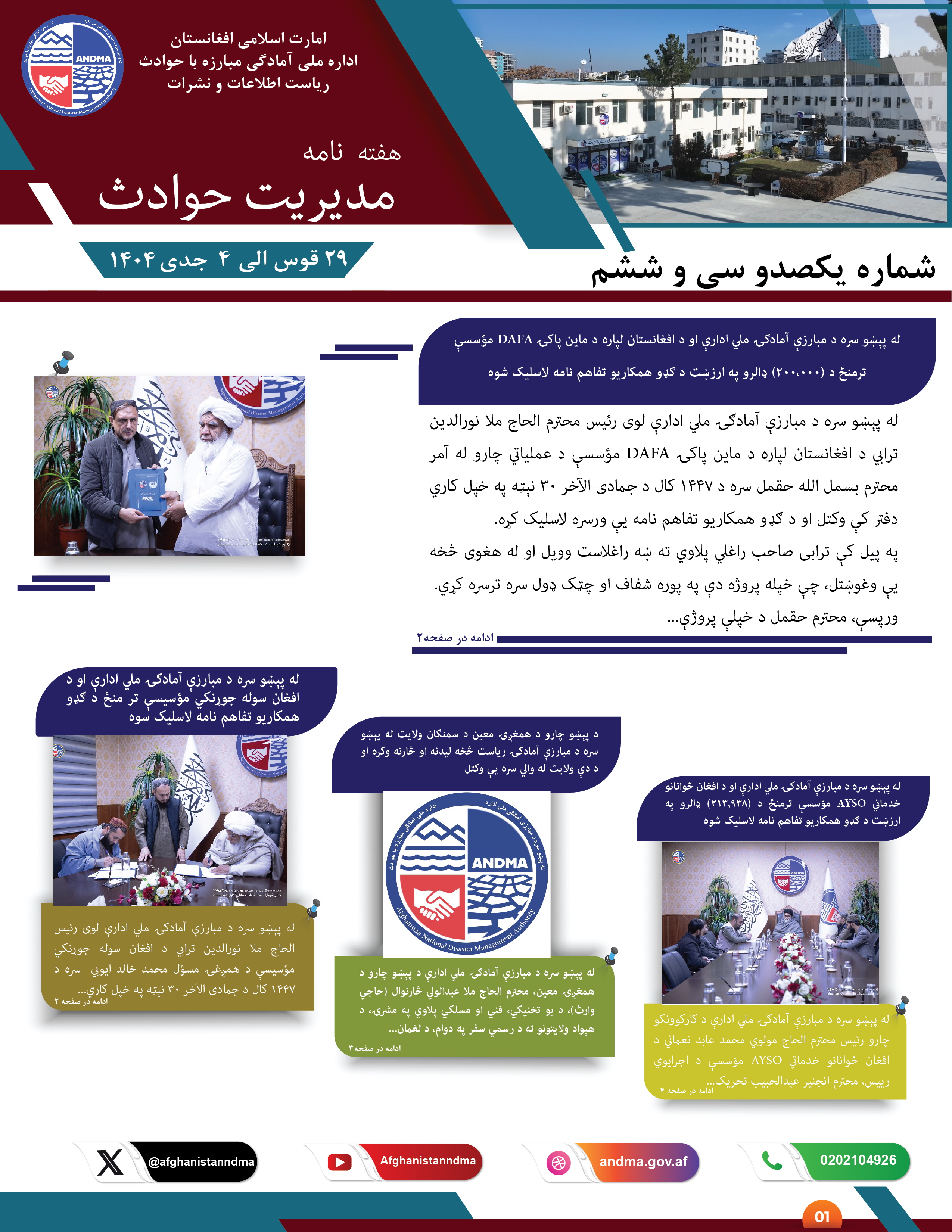قرار است اداره ملی آمادگی مبارزه با حوادث، روز سه شنبه، ۲۶ حمل سال روان، با حضور مقامات عالی امارت اسلامی و موسسات بینالمللی، از روز جهانی ماین پاکی تجلیل به عمل آورد، بنا از تمام . . .