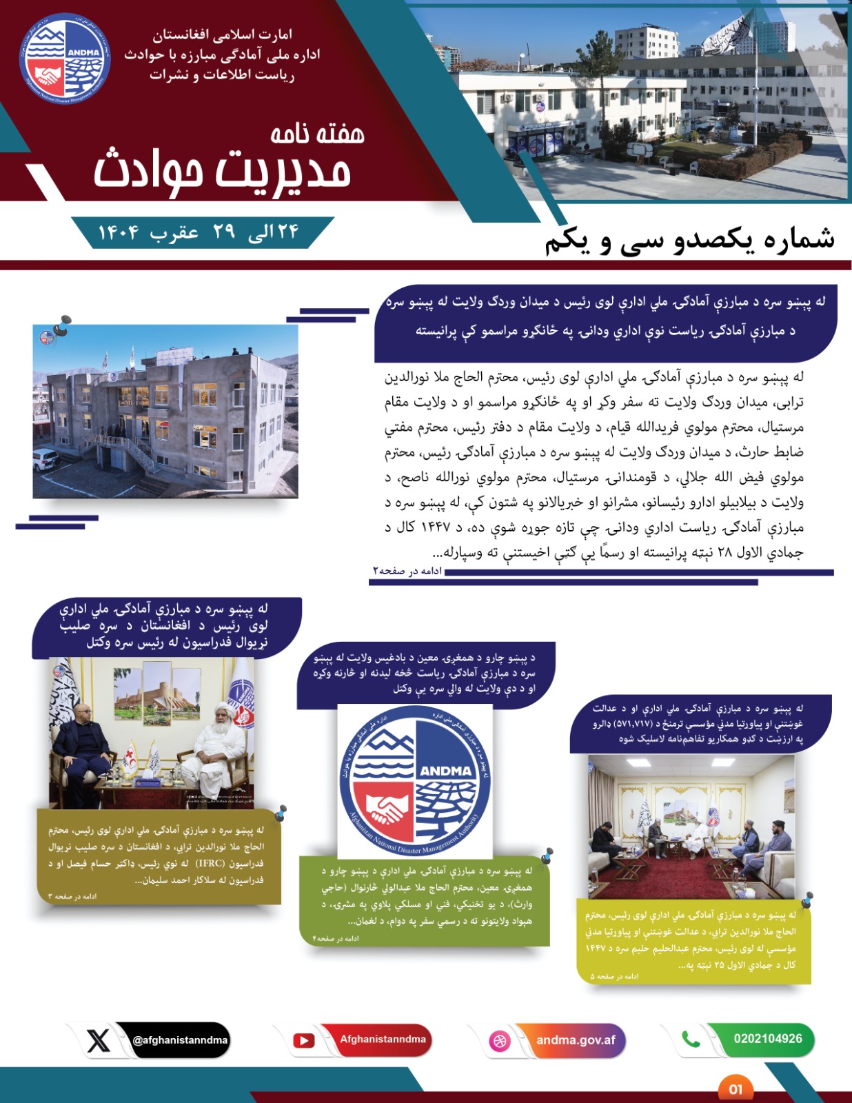 امروز شنبه پس از چاشت، محترم الحاج ملا نورالدین ترابی، رئیس عمومی اداره ملی مبارزه با حوادث، با عبدالعزیز سروری، رئیس مؤسسه کمکهای بشری و انکشافی برای افغانستان، در دفتر کاری خود دیدار. . .